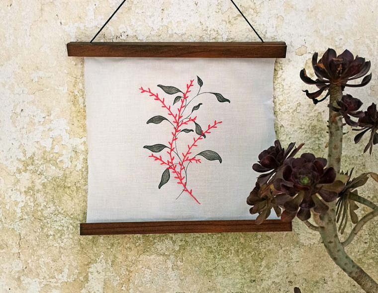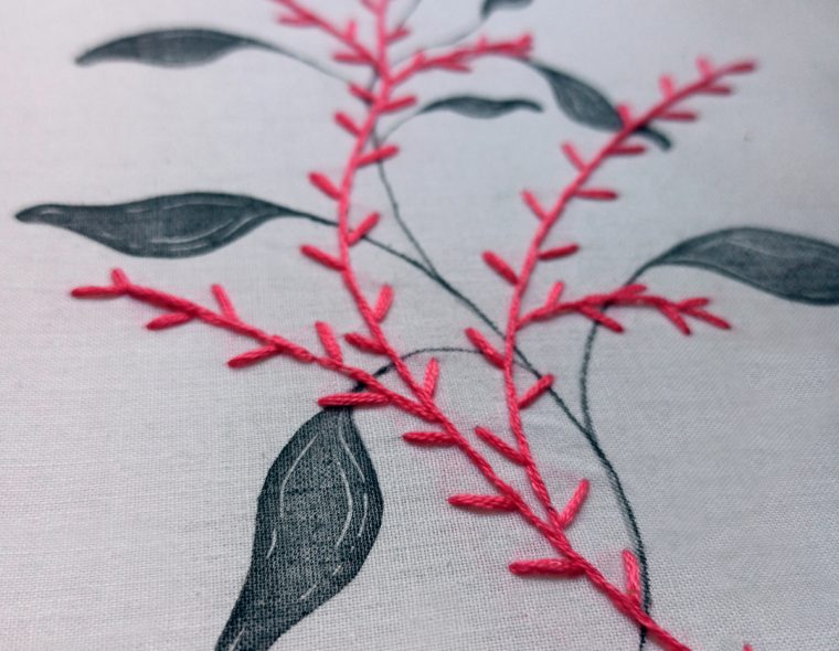 Sellos de hojas realizadas con la técnica de carvado y bordado sobre ellas.