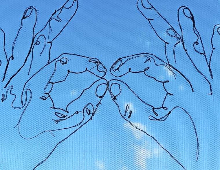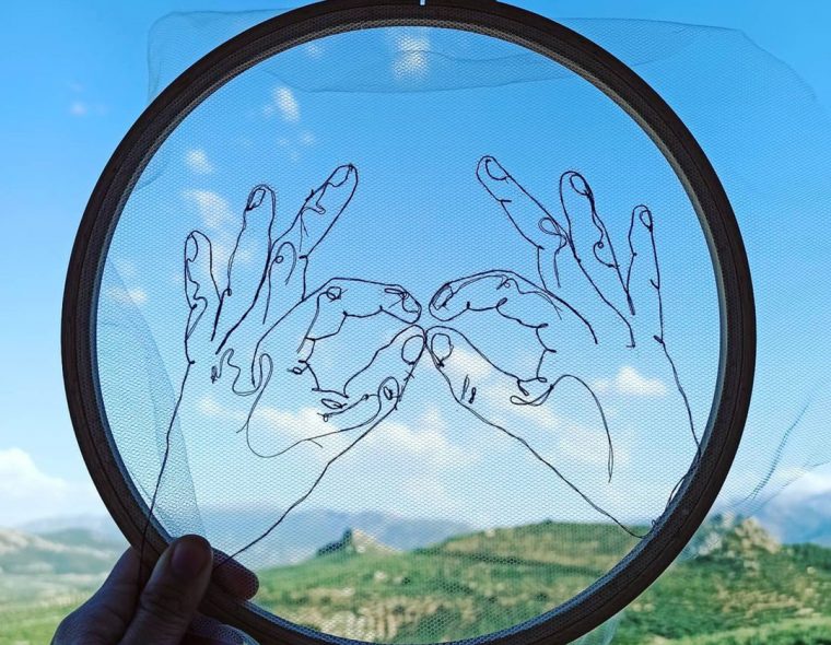 Bordado sobre tul con hilo perlé negro. Incluye bastidor de madera.
