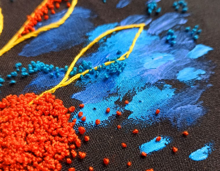Bordado abstracto sobre acrílico con diversas técnicas de bordado y punch needle. Incluye bastidor de madera.