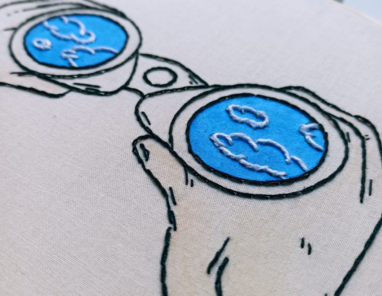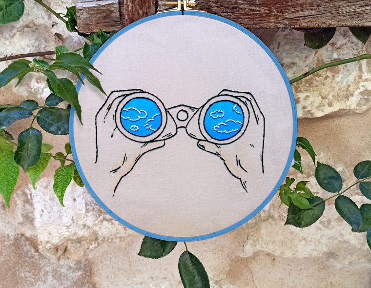 Ilustración bordada con hilo perlé y mouline sobre acrílico. Incluye bastidor de madera pintado.